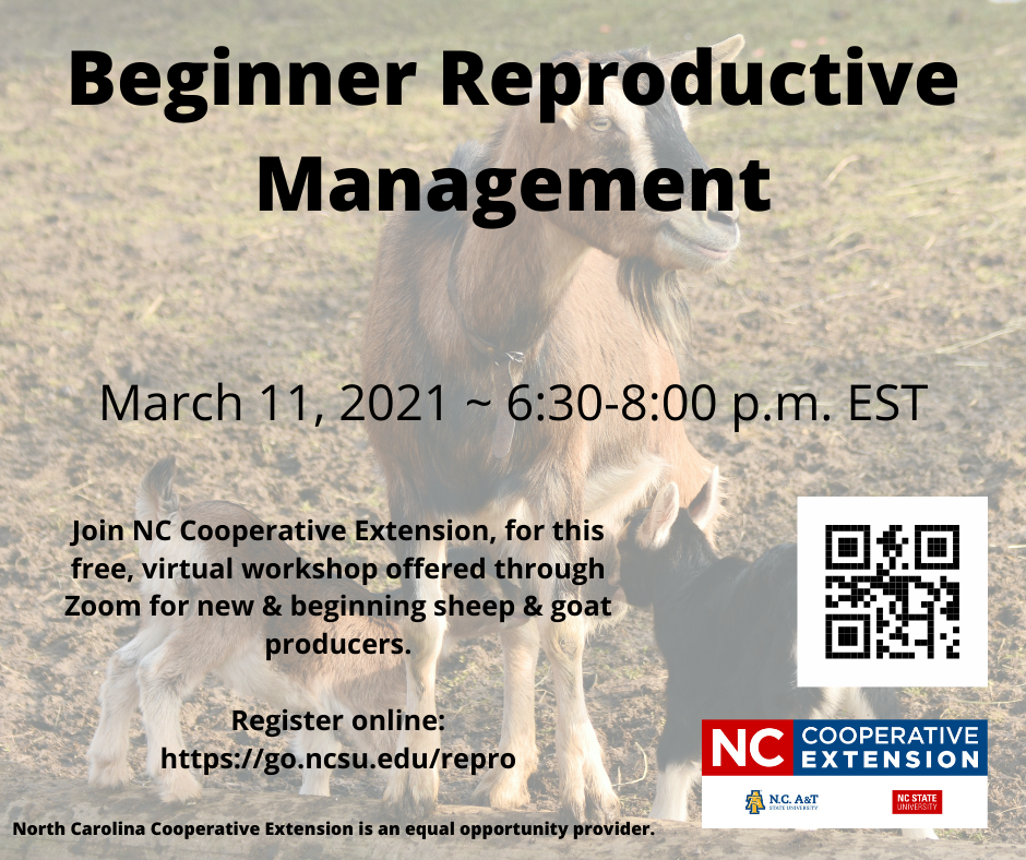 Join us on March 11, 2021, at 6:30 p.m. for a free webinar on reproduction management of small ruminants. Register at https://go.ncsu.edu/repro!